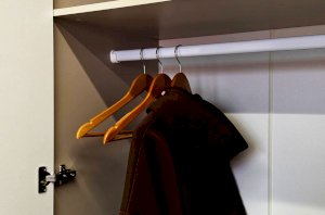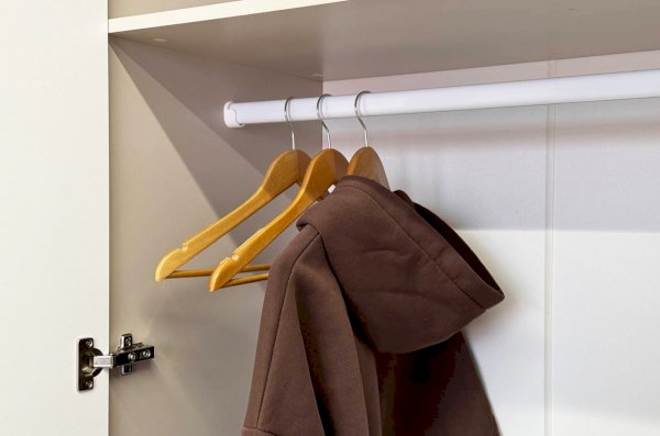 Шкаф оснащён длинными пластиковыми ручками и имеет удобное внутреннее наполнение: две большие полки и одна длинная штанга. Это позволяет рационально использовать пространство и разместить различные типы одежды.